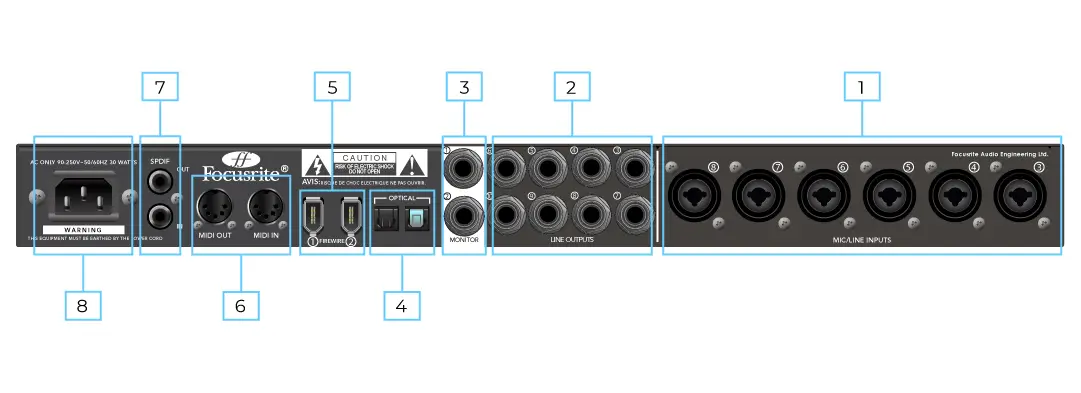 - Acht TRS-jack-aansluitingen voor gebalanceerde uitgangen 3-10. – accepteert zowel gebalanceerde als ongebalanceerde jacks.