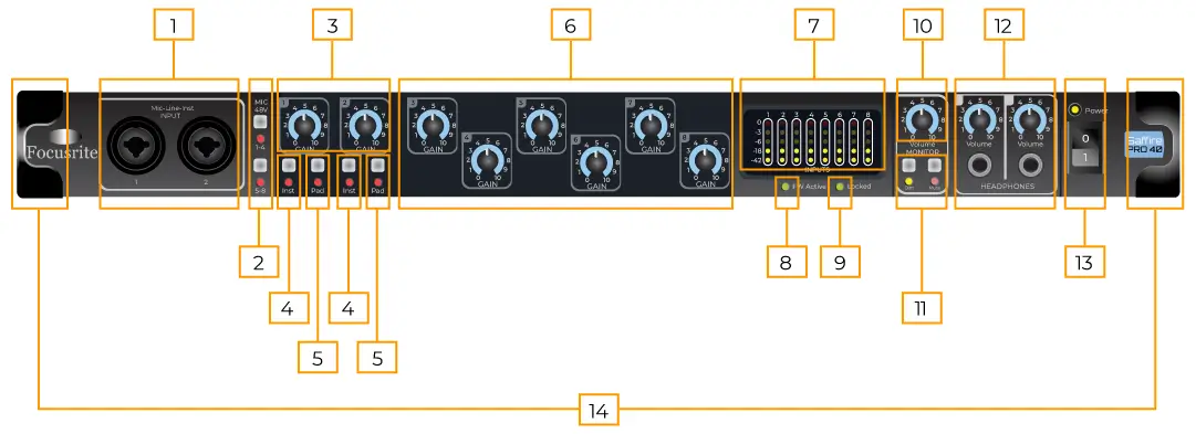 Aansluitingen en knoppen voorkant Saffire PRO 40