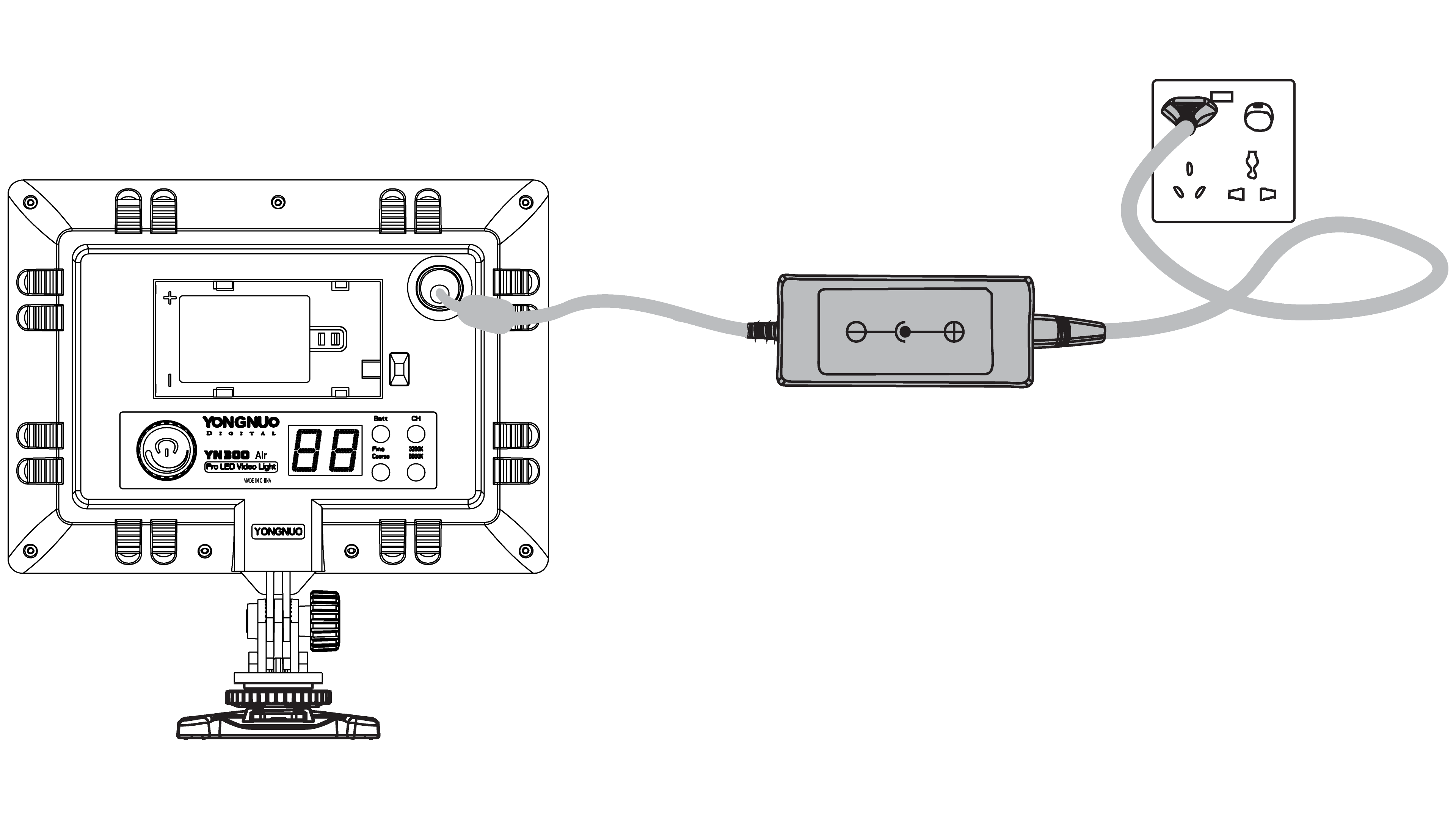 Het wordt aanbevolen om een YONGNUO-voedingsadapter te gebruiken met YN300 Air om een langdurige servicetijd te verkrijgen. Bij gebruik van een externe voeding, zal de videolamp de batterijvoeding automatisch stoppen en zal de batterij niet opgeladen worden. De aansluiting voor de externe voeding is buiten positief en de binnen negatief. De ingangsspanning is 8V en de elektrische stroom is 5A.