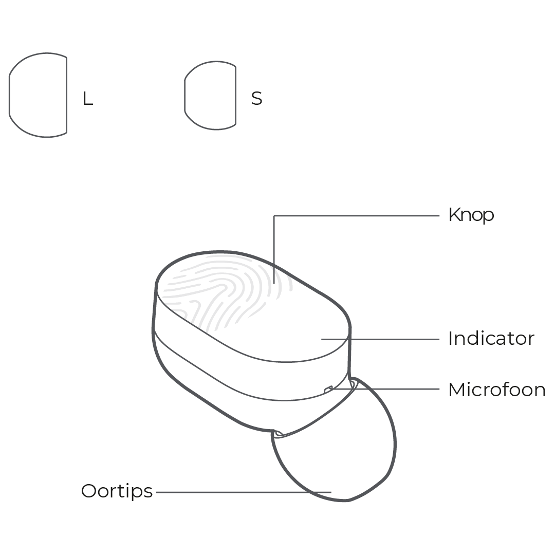 De oordopjes worden geleverd met de maat M oordopjes geïnstalleerd, je kunt overschakelen naar maat S of L als de geïnstalleerde maat niet bij je oor past.